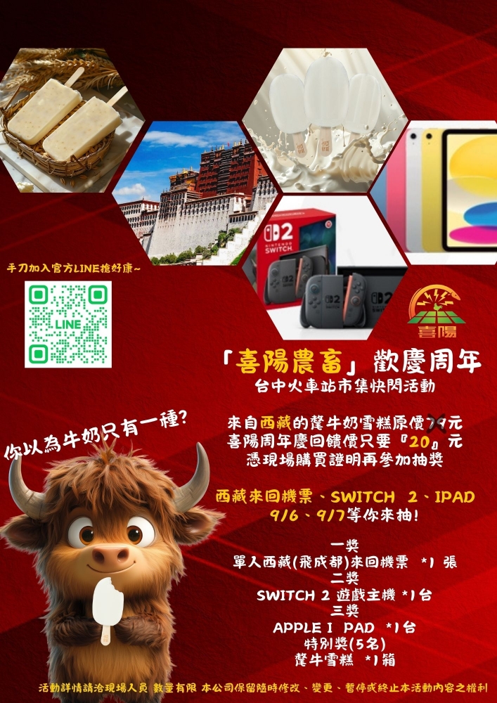 為了迎接炎炎夏日,喜陽農畜水產股份有限公司特別推出氂牛雪糕夏日限定款,這次的限定款包含多種清爽口味,如檸檬薄荷、芒果鳳梨與西瓜玫瑰,讓您在酷暑中享受一份透心涼的甜蜜。所有口味均選用天然水果和純正氂牛乳